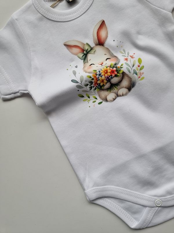 Body białe krótki rękaw królik z kwiatami rozmiar 68