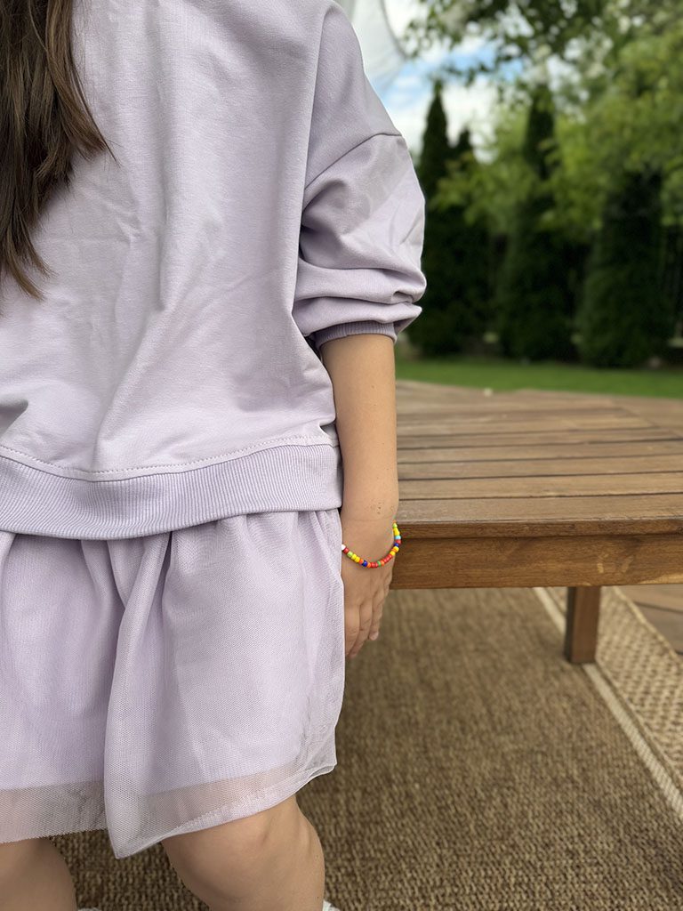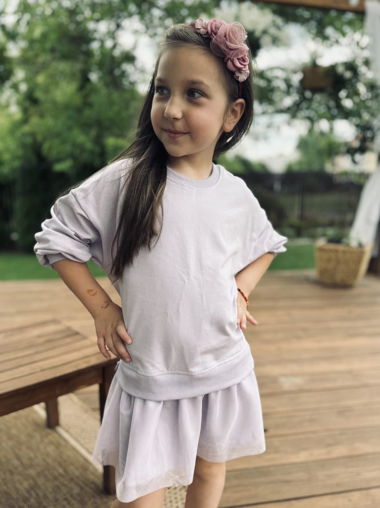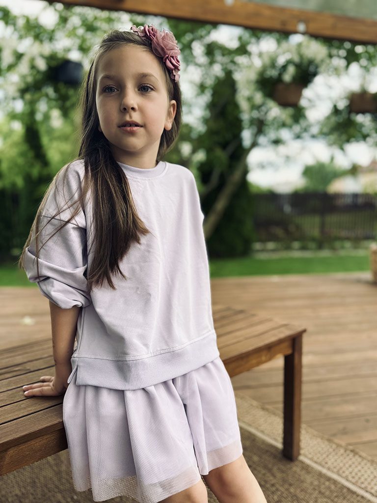 Liliowa bluza/sukienka z tiulem to połączenie wygody i dziewczęcego uroku, które pokochają małe księżniczki.