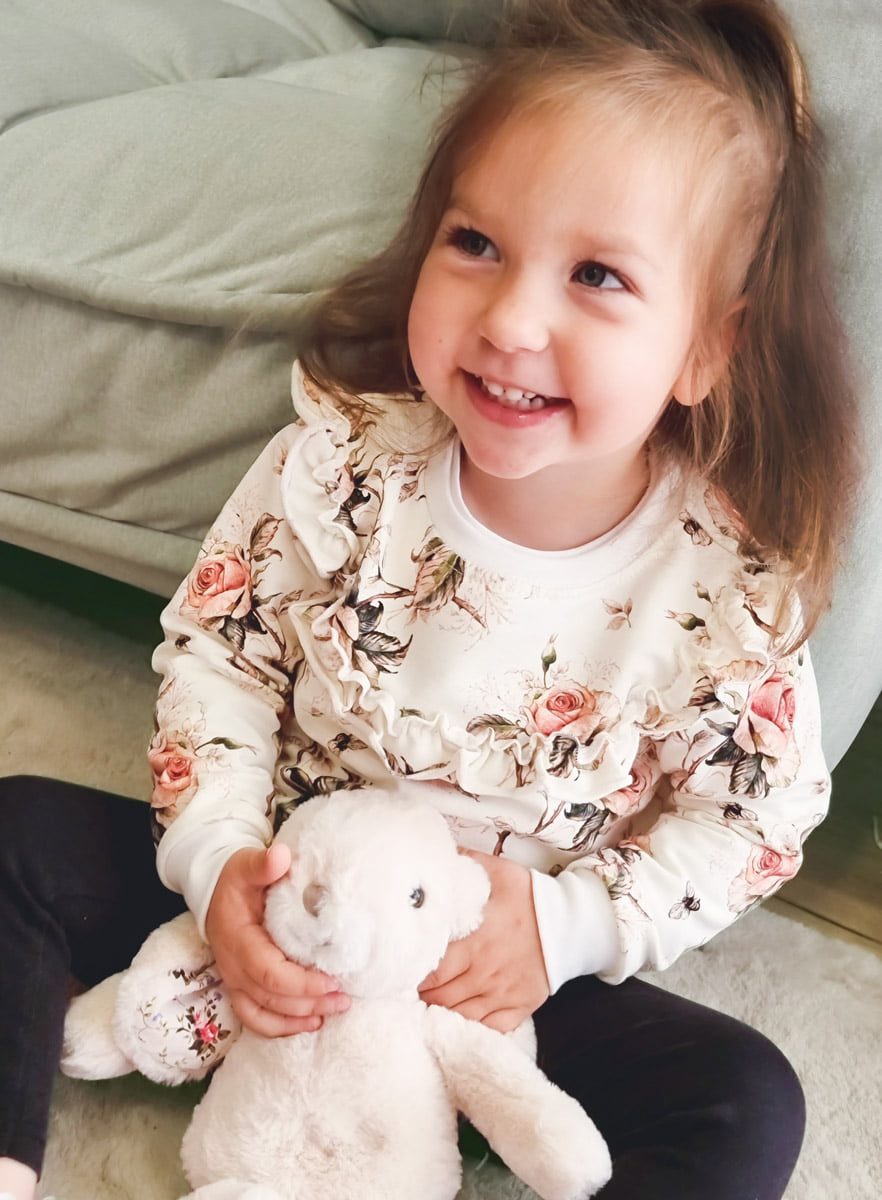Bluza dresowa wykończona falbanką na przodzie. Delikatny kwiatowy wzór będzie pięknie się prezentował na każdej dziewczynce. Ubranko wykonane jest z polskiej dresówki w której skład wchodzi 95%bawełny i 5%elastanu.
