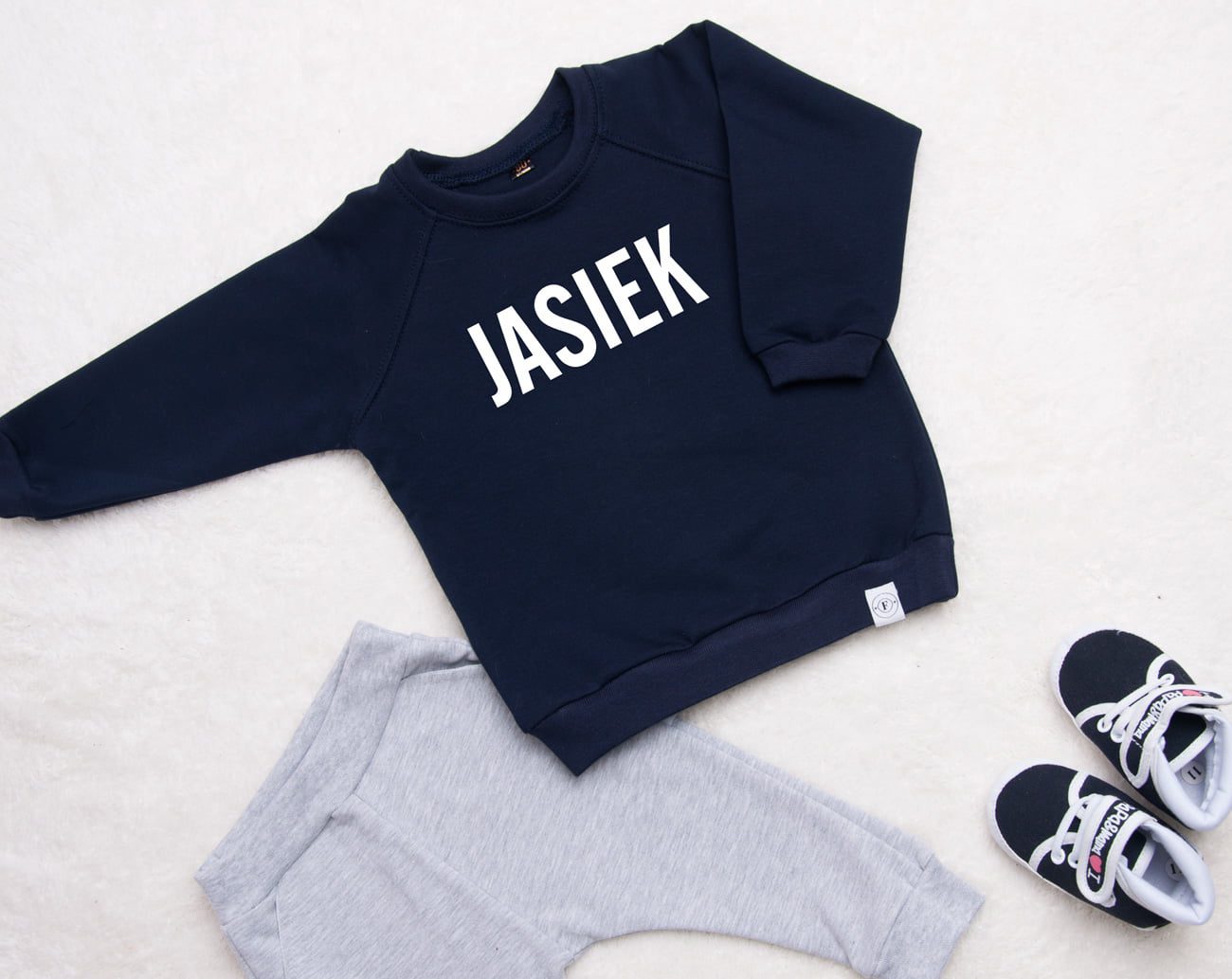Bluza jest koloru granatowego i posiada biały nadruk dowolnego imienia.