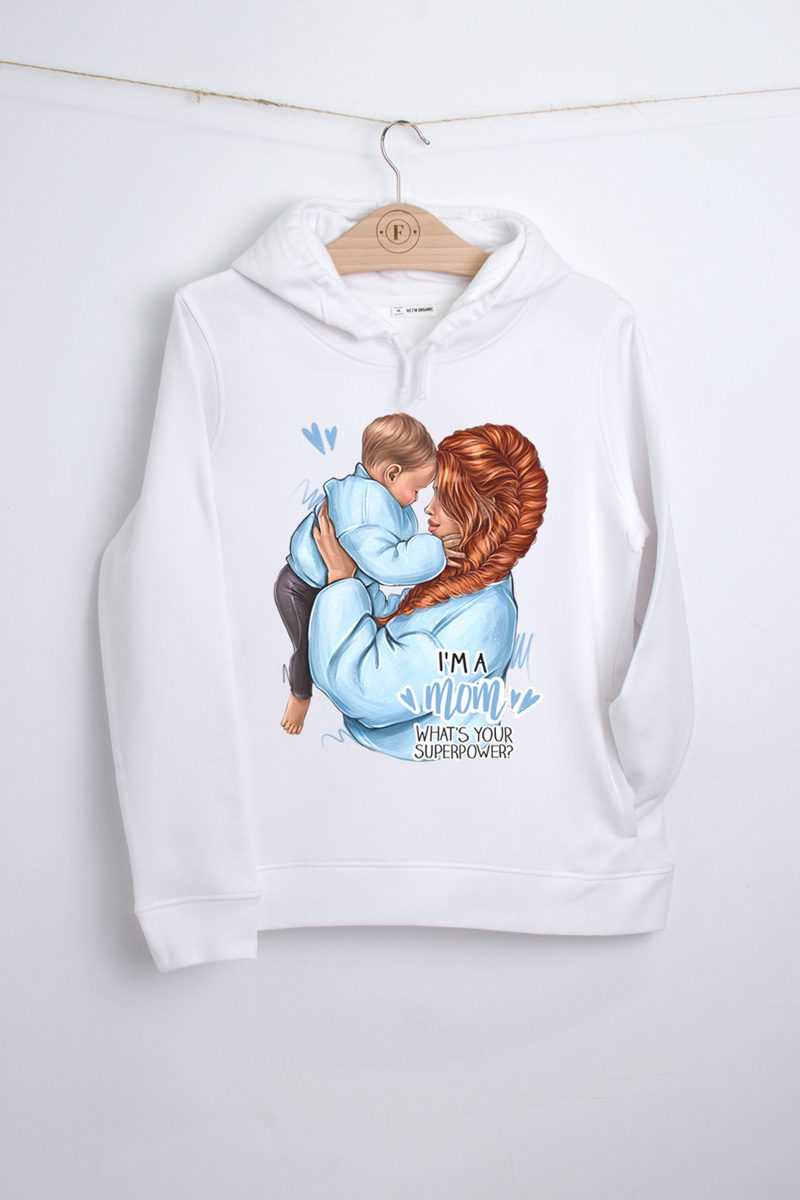 Piękna grafika ukazująca miłość mamy do dziecka oraz napis I’m a mom what’s your superpower? Do wyboru kolor włosów mamy.