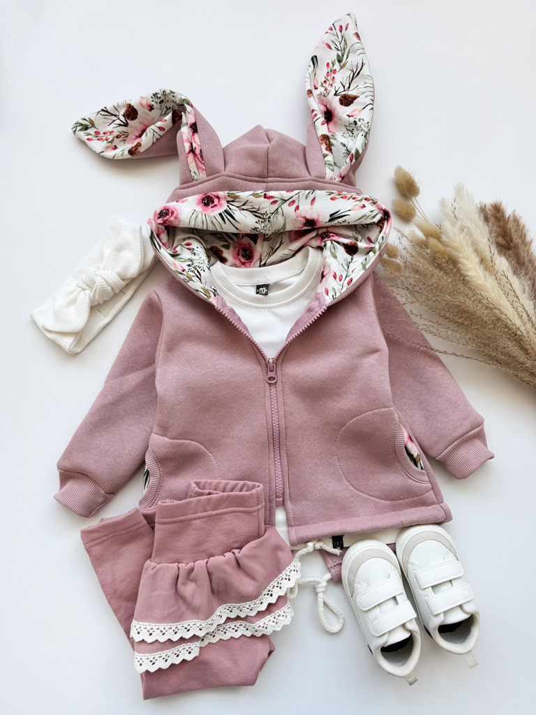 - Kaptur, kieszenie jak i uszy są wykończone materiałem w kwiatowy wzór.
