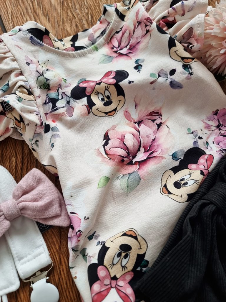 - Body w kwiaty dla dziewczynki ozdobione falbankami przy rękawkach.