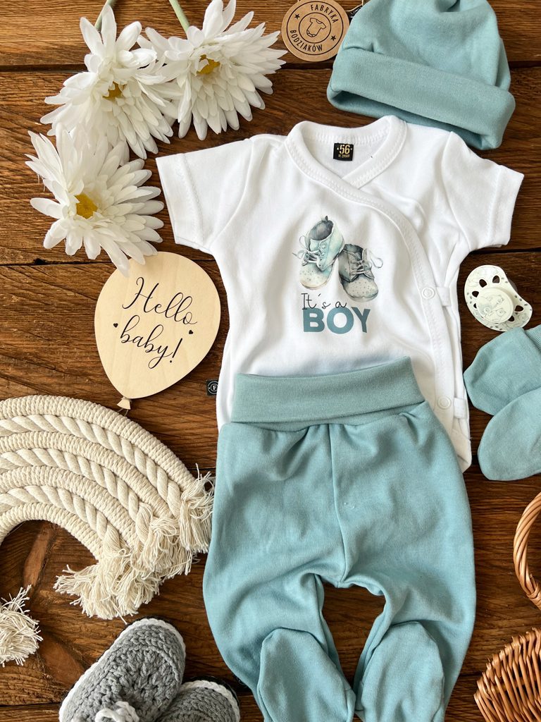 Body niemowlęce z grafiką bucików i napisem it’s a boy