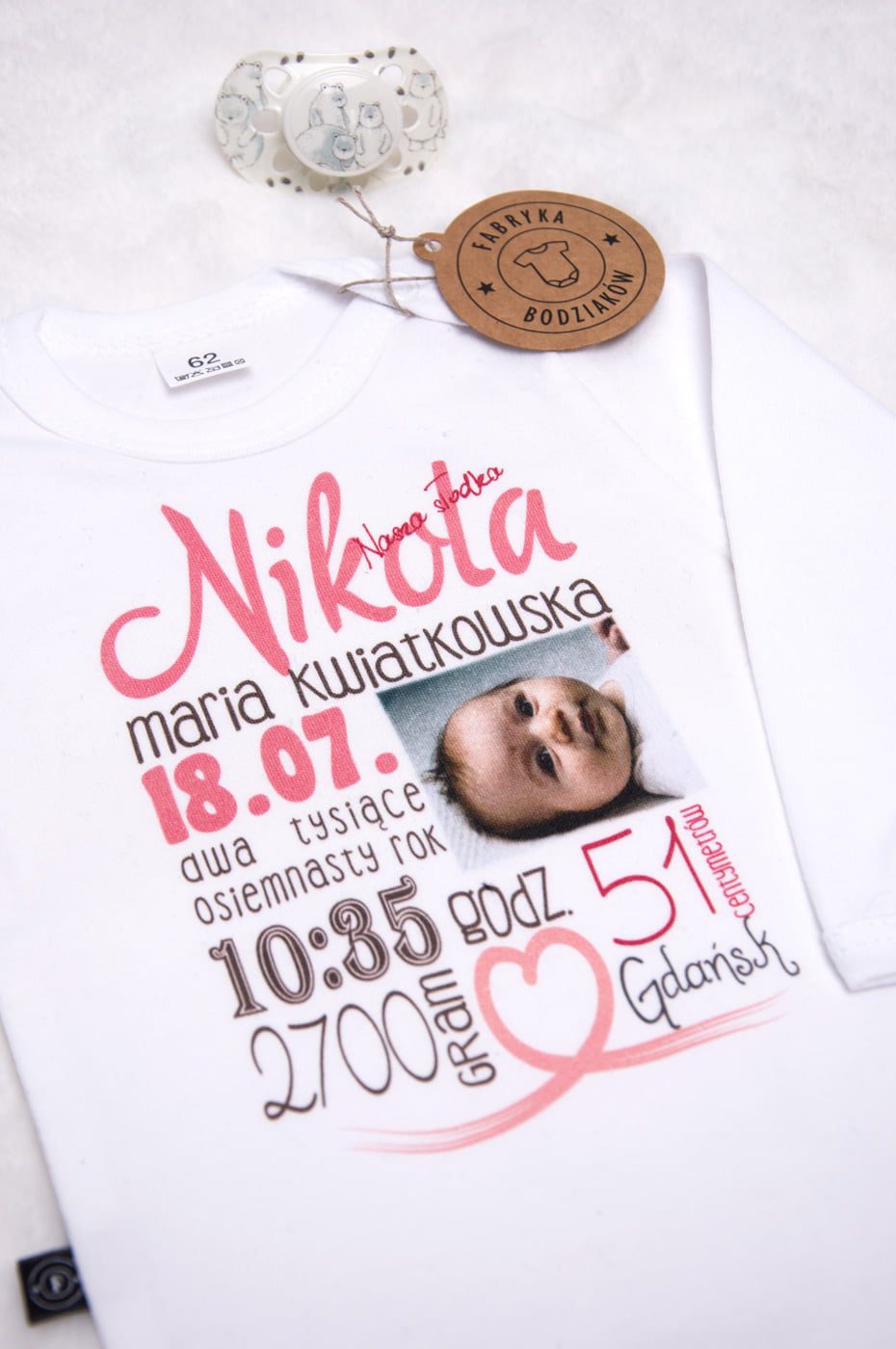 Body z nadrukiem metryczki M4 – wykonane jest z wysokiej jakości polskiej 100% bawełny, miękkiej w dotyku, delikatnej dla skóry dziecka.