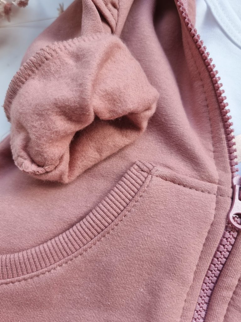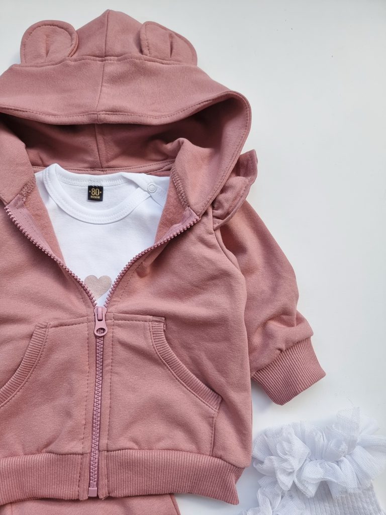 • Komplet składa się z bluzy z kapturem i naszytymi na nim uszkami misia oraz spodenkami z kieszonkami po boku.
