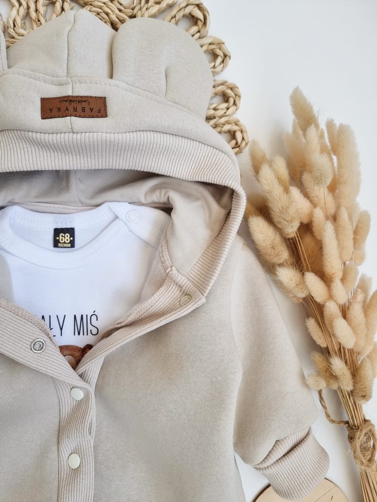 - Dresowy kombinezon dla niemowlaka z kapturem ozdobionym uszkami misia.