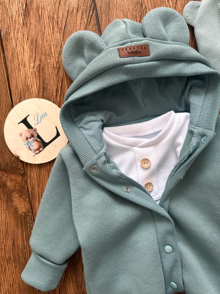 - Dresowy kombinezon dla niemowlaka z kapturem ozdobionym uszkami misia.