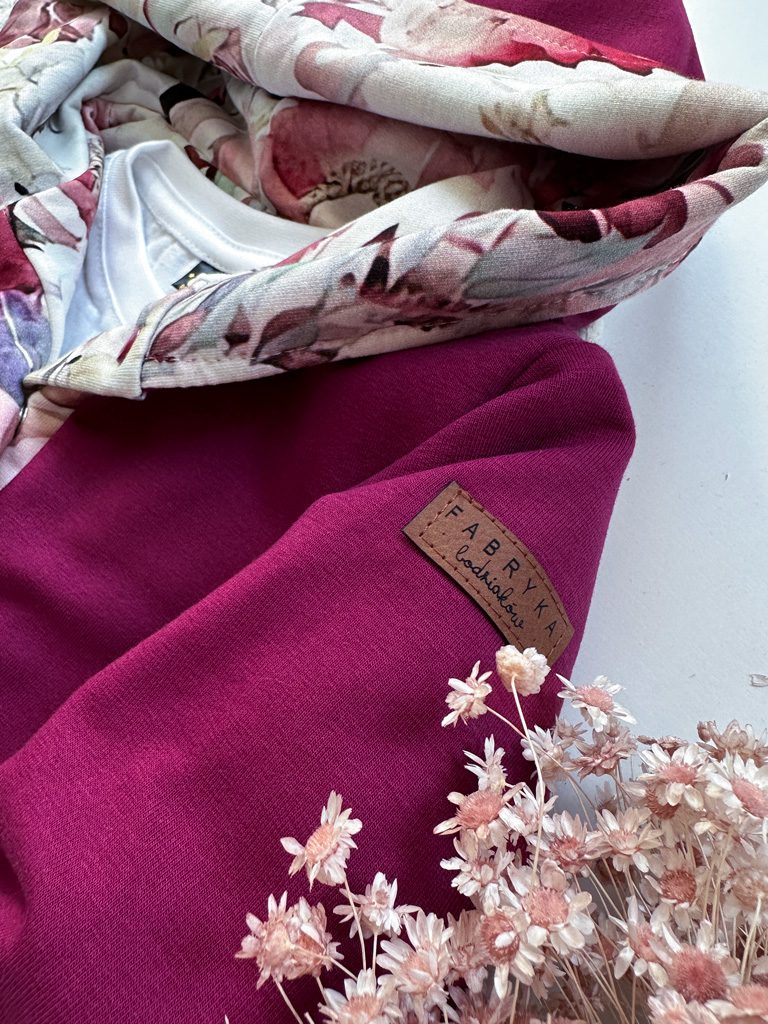 - Z jednej strony gładka, w kolorze fuksji, z drugiej w kwiatowy print.