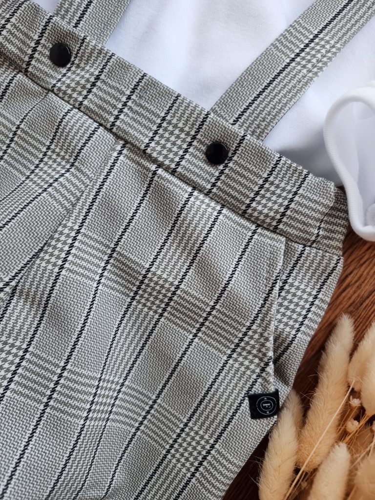 - Elegancki komplet dla chłopca: spodnie na szelkach i koszulka lub body z muchą.