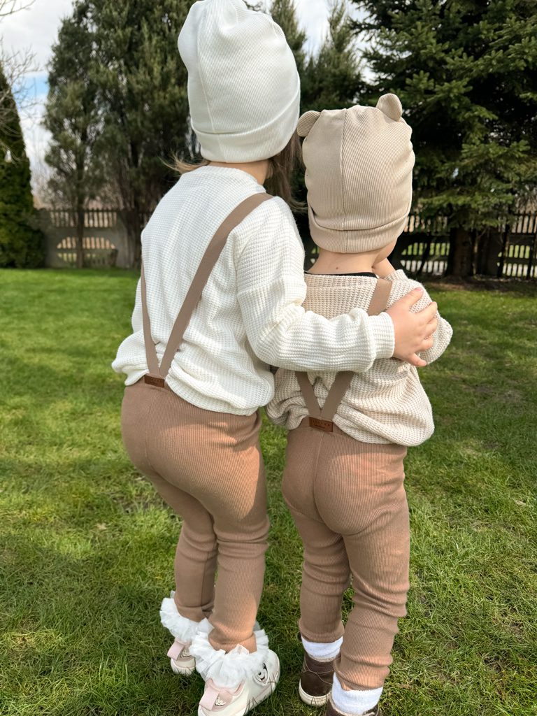 - Getry prążkowane z szelkami w kolorze beżowym.