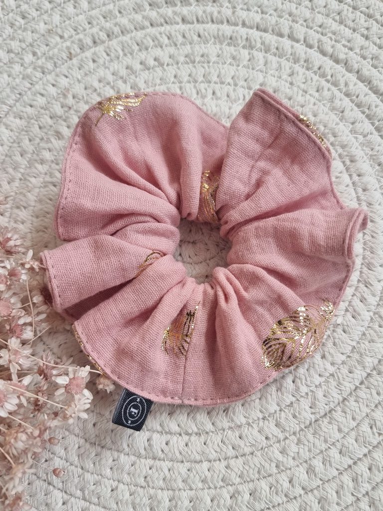 Gumka scrunchie do włosów różowa haftowane kwiatuszki