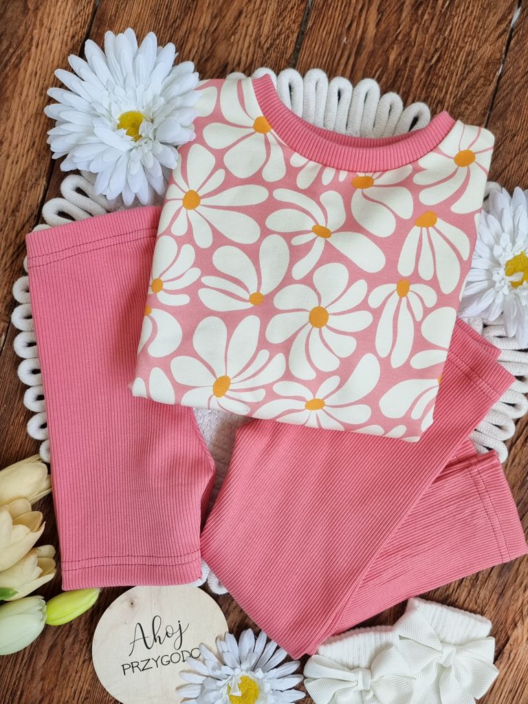 Komplet składający się z trzech elementów: bluzy oversize z uroczymi falbankami przy rękawkach i printem w stokrotki, getrów prążkowanych.
