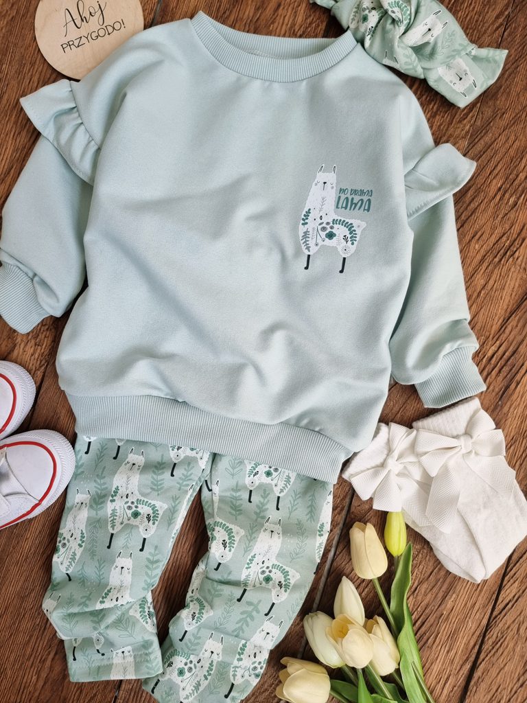Komplet dla dziewczynki składa się z bluzy oversize z uroczymi falbankami przy rękawkach oraz nadrukiem lamy no drama lama.