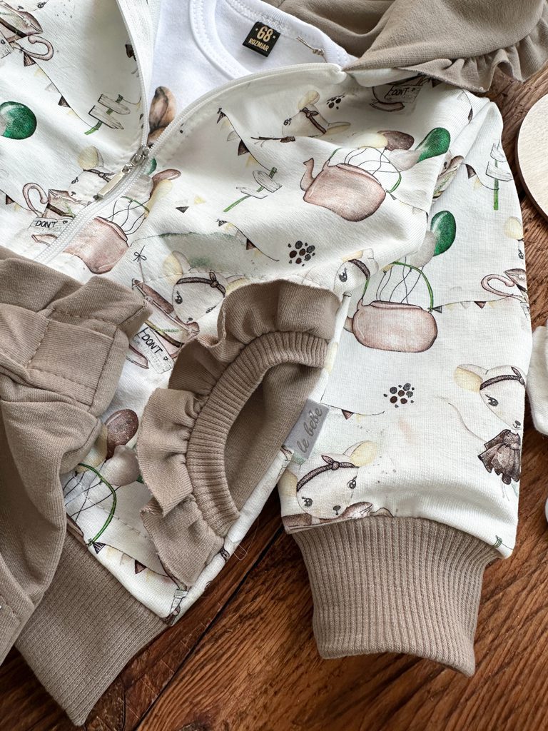 - W komplecie bluza z kapturem zasuwana na suwak oraz spodnie z wiązaniem kokardą w pasie.