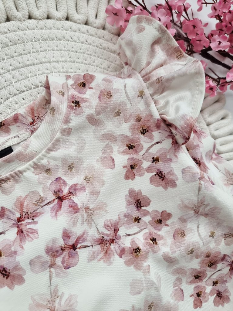 - Bluzka ma ozdobione falbankami przy rękawkach.