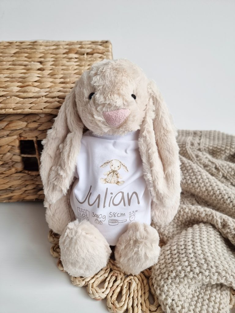 - Urocza maskotka króliczek w koszulce z nadrukiem metryczki.