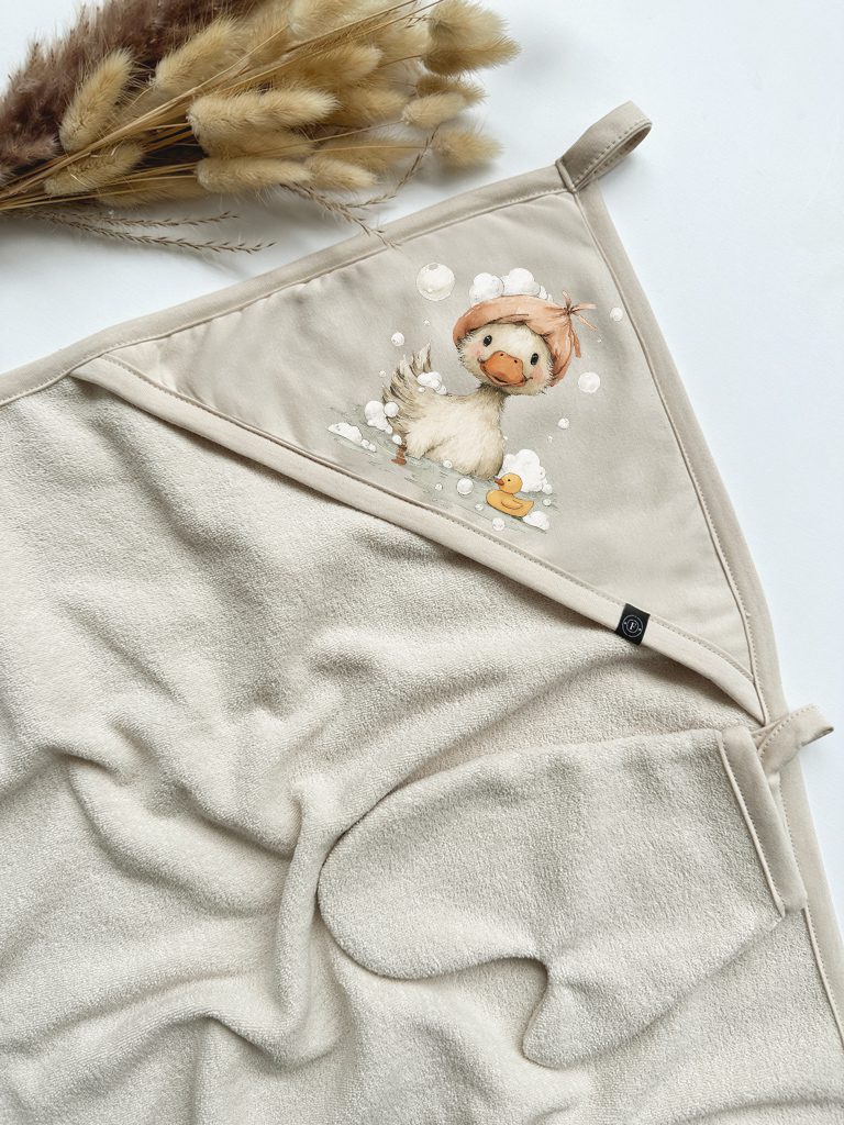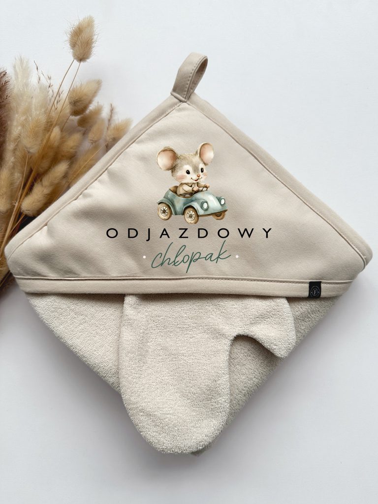 Ma wymiary 100x 95cm (+/-5cm), co pozwoli Ci używać go przez dłuższy czas. Okrycie bardzo dobrze wchłania wodę. Od wewnętrznej strony ręcznik ma miękką i ocieplaną warstwę materiału. Posiada kaptur, który okryje mokrą głowę dziecka bezpośrednio po kąpieli. Do tego również dołączona jest rękawiczka uszyta z tego samego materiału by nie podrażniać wrażliwej i delikatnej skóry Twojego dziecka. Dostępny w różnych kolorach.