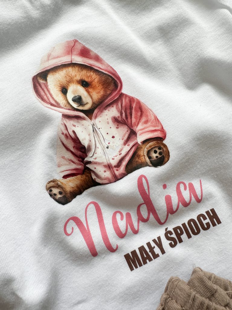 Beżowo biała piżama dziecięca z nadrukiem misia i imienia
