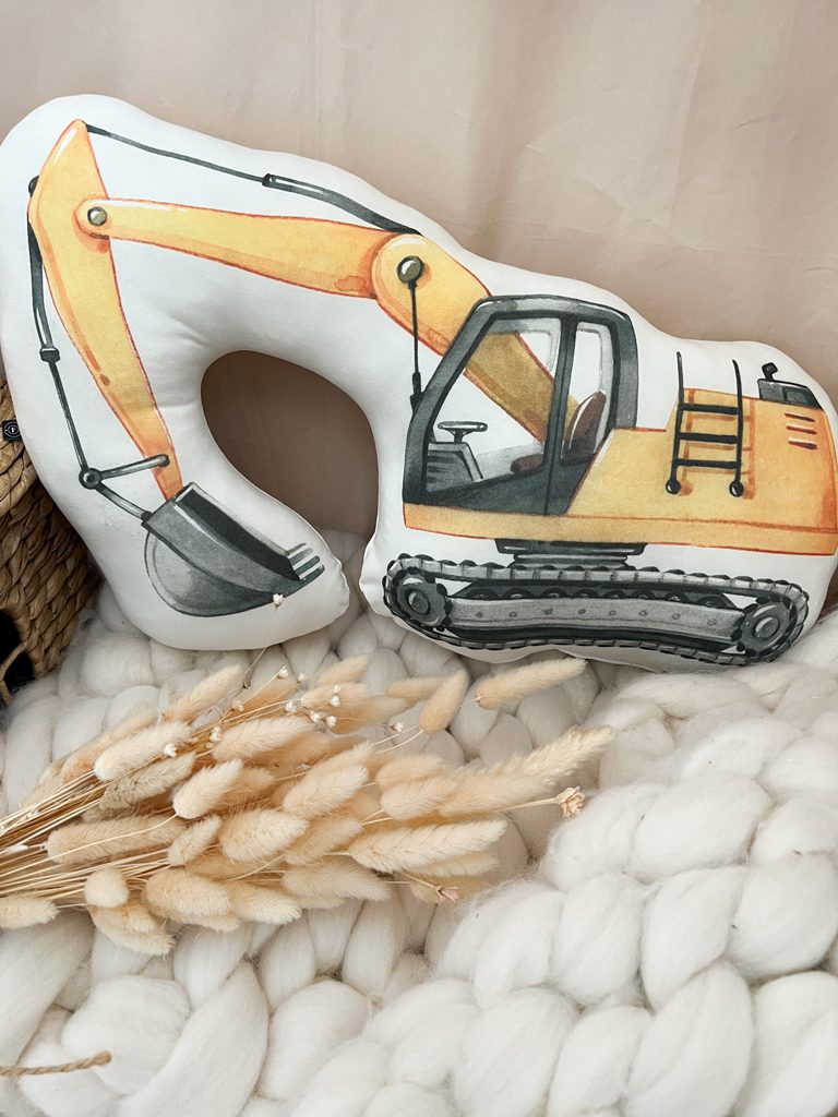 Poduszka w kształcie koparki to świetny pomysł na ozdobę do pokoju dziecięcego na łóżko.