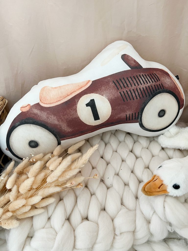 Poduszka w kształcie wyścigówki to świetny pomysł na ozdobę do pokoju dziecięcego na łóżko.