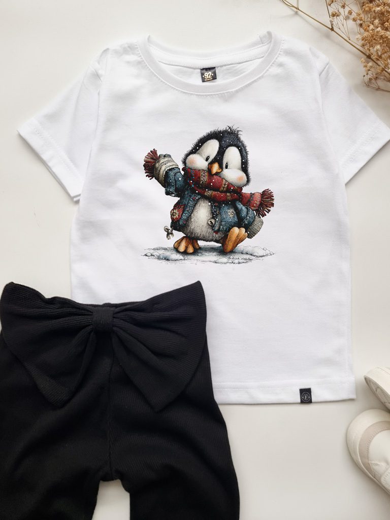 Komplet biała koszulka z nadrukiem pingwinka i czarne getry z kokardą rozm. 98