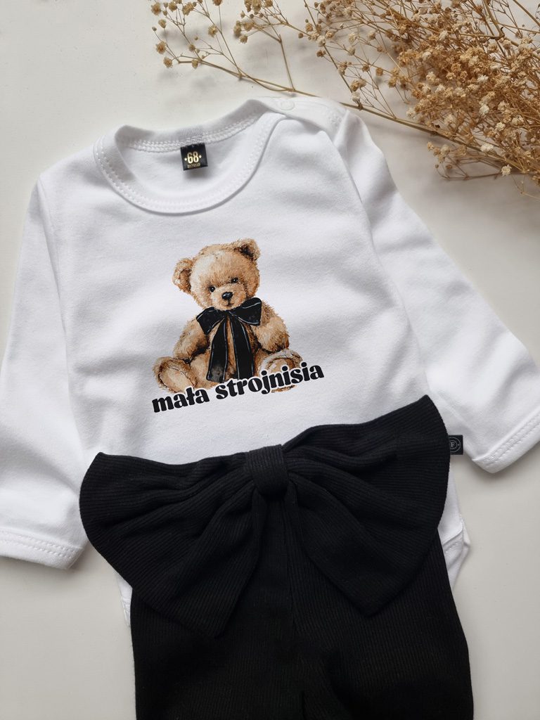 Komplet białe body z nadrukiem misia i czarne getry z kokardą