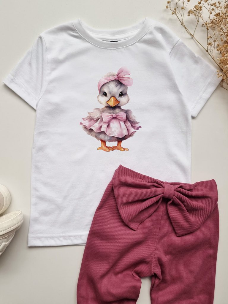 Komplet biała koszulka z nadrukiem kaczuszki i getry z kokardą malaga