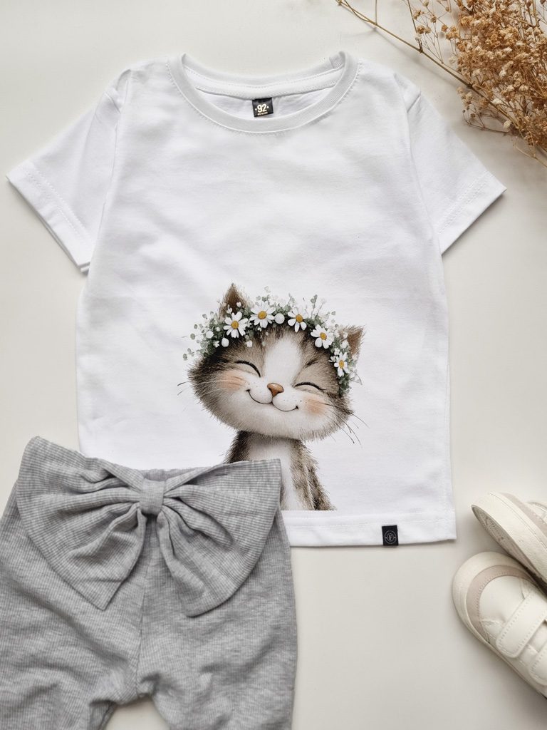 Komplet biała koszulka z nadrukiem kotka i szare getry z kokardą rozm. 92