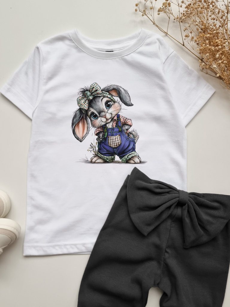 Komplet biała koszulka z nadrukiem króliczka i grafitowe getry z kokardą